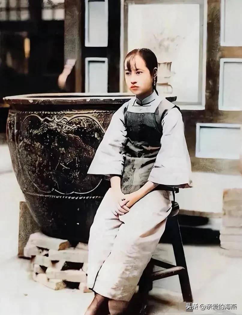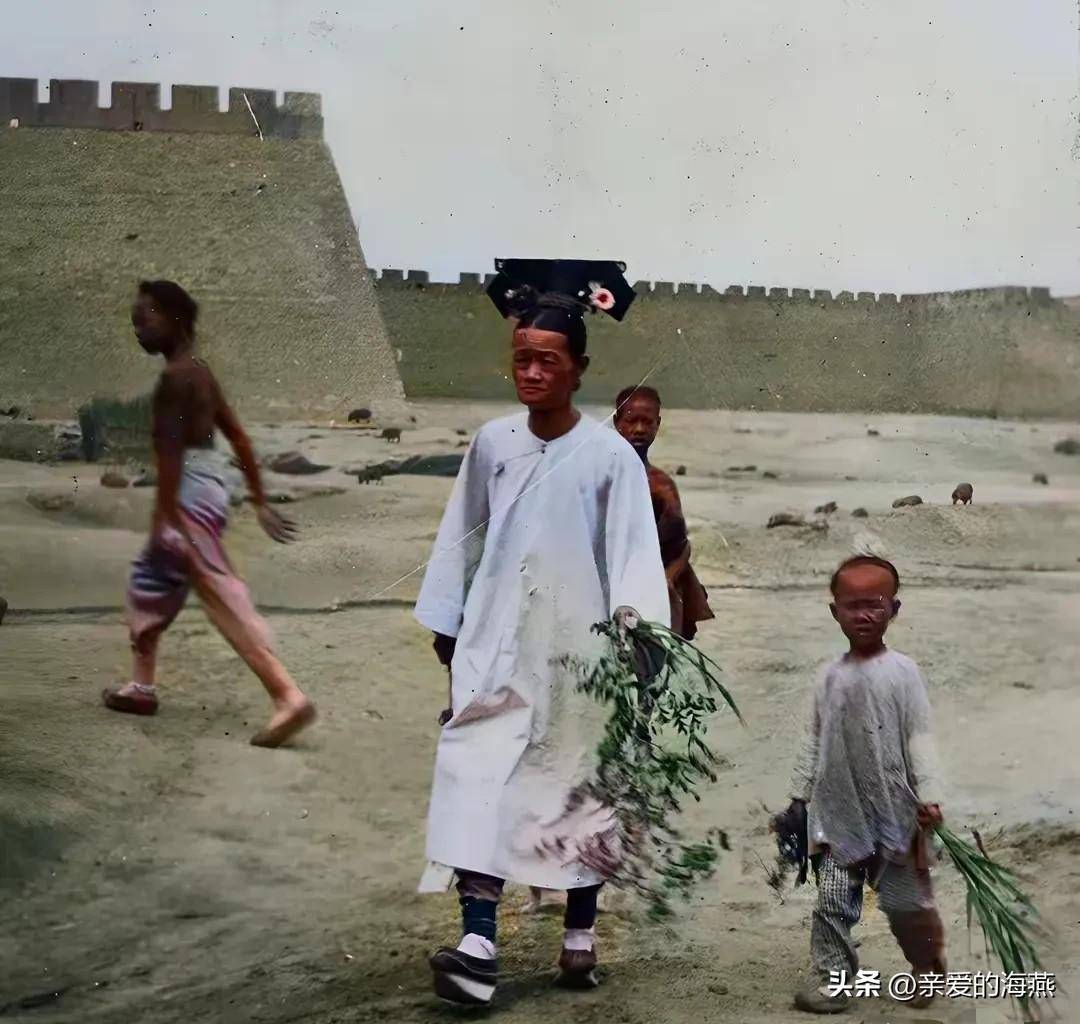 清朝末年的妇女服饰也是时代的象征。在端午节时期,一名母亲和她的女儿刚从田间采摘艾蒿回来,身着满清传统服饰,这种装束典型地代表了当时的上层社会。