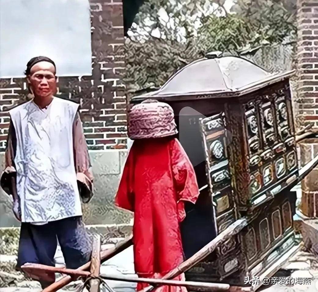 最后,晚清时期的婚礼也有其独特的地方风情。许多地方的新娘头上会戴“新妇罩”,一种类似“箩筐”的传统头饰,这种独特的婚礼习俗在今天已经少见了,取而代之的是更加普遍的红盖头。