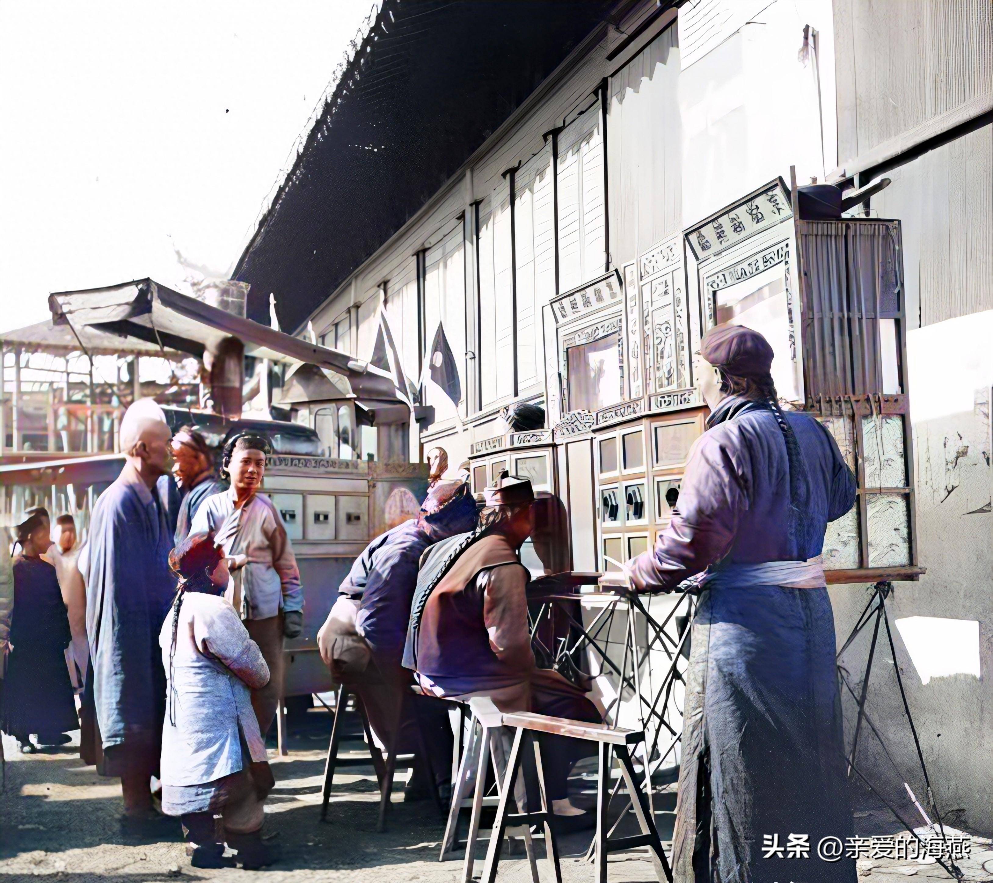 在集市上,孩子们围观拉洋片,这是一种廉价的娱乐活动,象征着那个时代孩子们的天真与欢乐。小小的拉洋片,成为了许多人的童年记忆。